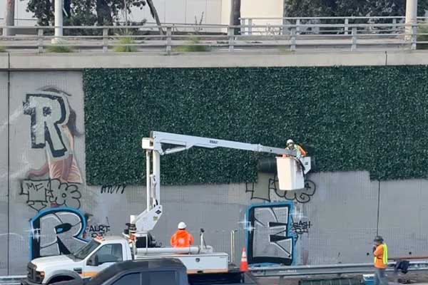 101 프리웨이 다운타운 구간 벽의 낙서에 캘리포니아 교통국이 인조아이비로 조경을 새로하고 있다. grafftv1 인스타그램
