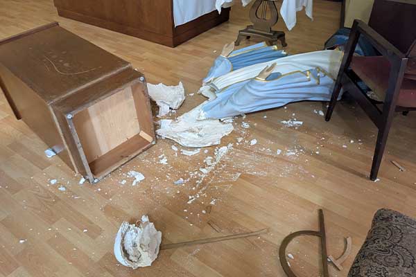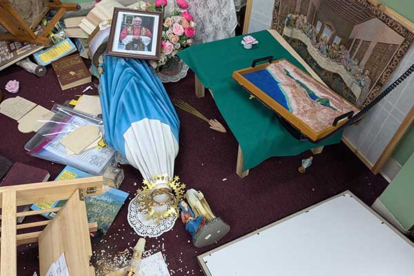 트립은 “음향 장비 같은 것들이 벽에서 뜯겨 나갔고, 옷장이 있던 곳마다 안에 있던 물건들이 전부 끄집어내어져 있었다”며 “이 정도는 예상할 수 있다고 생각했지만, 전혀 예상하지 못한 건 성소 부분이었다”고 말했다. 그는 이어 “커다란 성모 마리아 상이 밀려 넘어져 완전히 파괴됐고, 주님이 모셔진 금색 감실도 열어 성체를 꺼내려 한 흔적이 있었다”고 덧붙였다.