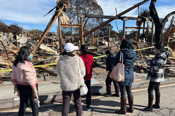 팰리세이즈 산불로 사업체가 불타버린 자리 앞에서 직원들이 멍하니 서있다. X@joelpollak