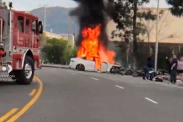 LA 샌퍼낸도 밸리에서 9일 아침 테슬라 차량이 충돌 사고 이후 불이 나 2명이 병원으로 이송됐다.
