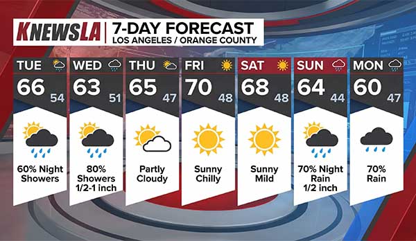 국립기상청은 지역 예보를 통해 강수량이 초기 예상보다 다소 늘어 평균 최대 1인치, 고지대와 벤추라 카운티 북쪽 지역에서는 최대 2.5인치에 이를 수 있다고 밝혔다.