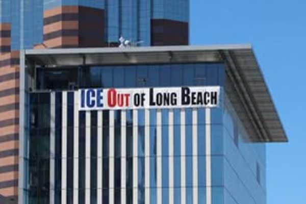 시청 발코니에 걸린 이 배너는 최근 시의회가 연방 집행 방식에 대한 책임을 요구하는 결의안을 통과시킨 데 따른 것으로, 시 관계자들은 이러한 방식이 롱비치와 같은 지역사회에 피해를 줬다고 주장하고 있다.