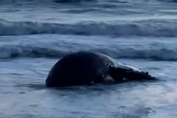 뉴포트 비치 해안에 18일 길이 30피트, 약 10톤의 혹등고래 사체가 떠밀려 왔다.