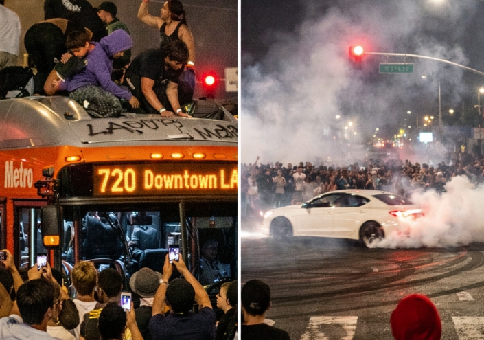 주말 동안 LA에서 열린 거리 점거 현장을 지켜보던 군중이 막힌 교차로에 멈춰 선 메트로 버스 위로 올라타고 낙서를 하는 사건이 발생했다.