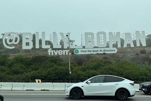 구조물에는 높이 30피트, 길이 230피트에 달하는 ‘@Billy_Boman’ 문구와 함께 “최고의 AI 감독을 찾아라(Find the best AI directors)”라는 검색창 형태의 문구가 포함돼 있다.