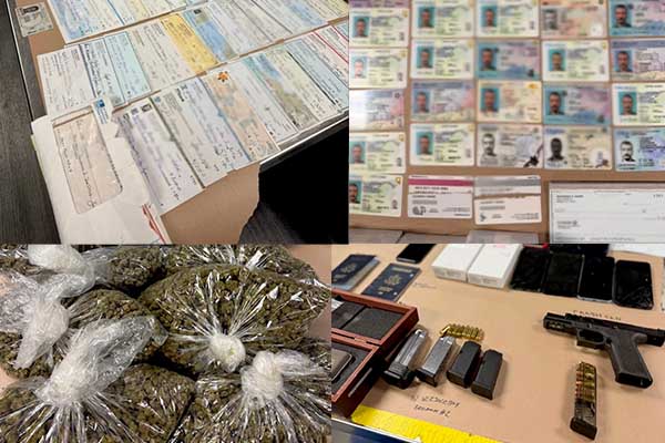 버뱅크 경찰이 사기범 검거에서 압수한 체크와 위조신분증, 불법 총기, 그리고 마약(왼쪽 위 부터 시계방향). 버뱅크 경찰