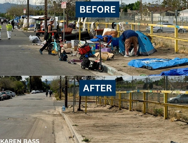 노스할리우드 텐트촌 정리 전후 모습. 도로변을 점유하던 텐트와 물품이 철거되며 거리 환경이 정비됐다. 사진=캐런 배스 시장실
