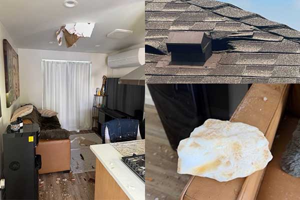 얼음덩어리가 추락한 주택 내부에 구멍이 크게 뚤려 있다. 얼음덩어리가 떨어진 지붕. 얼음덩어리(왼쪽사진부터 시계방향으로). 재니스 한 페이스북