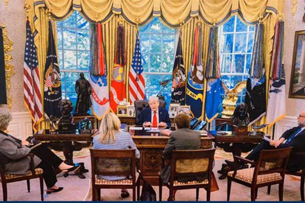 트럼프 대통령과 캐런 배스 LA 시장, 캐서린 바거 LA 카운티 수퍼바이저(사진 가운데부터 시계방향)가 백악관에서 2025 LA 산불 관련 면담을 하고 있다. 캐서린 바거 LA 카운티 수퍼바이저 제공