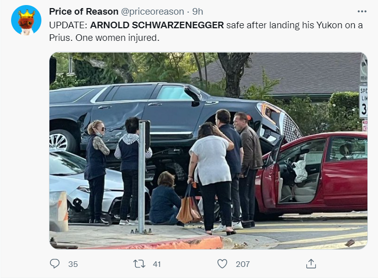 그의 대변인은 “슈워제네거는 무사하다. 그가 유일하게 걱정하는 것은 다친 여성의 상태”라고 말했다.