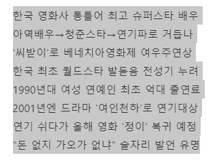 한동안 연기 활동을 쉬었던 강수연은 최근 복귀를 준비 중이었다. 연상호 감독의 영화 ‘정이’에 배우 김현주와 함께 캐스팅 돼 촬영을 모두 마친 상태였다.