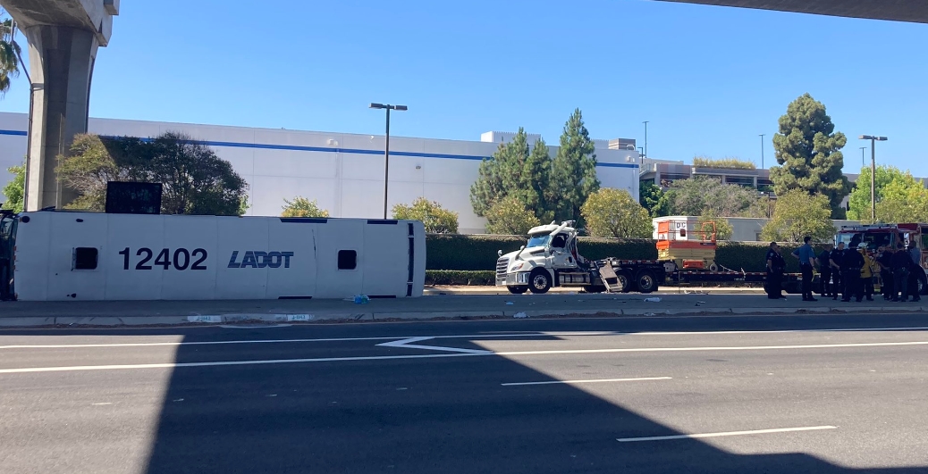 LA교통국(LADOT)이 운영하는 통근 버스가 27일 엘 세군도 인근에서 주차된 트랙터-트레일러와 충돌했다.