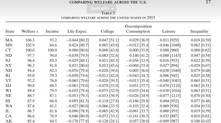 각 주별 생활수준에 대한 분석은 기대수명, 교육, 생계비 대비 소비수준, 노동시간, 평등과 불평등의 문제 등을 종합적으로 수치화해서 진행된다.