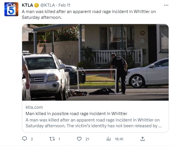 KTLA 방송에 따르면, 숨진 이 운전자는 운전 중 우버차량 운전자와 시비가 붙어 몇 블록을 뒤쫓아 오다 컬렌 애비뉴 인근에서 우버 차량을 가로 막고