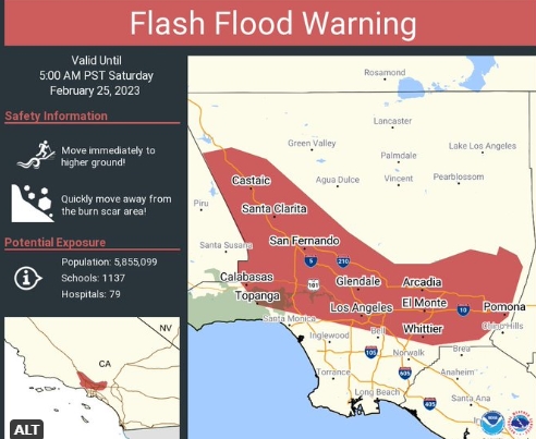 LA 전역에 24일 새벽부터 눈폭풍 경보가 발령된 가운데 국립기상청은 이날 2시부터 LA 전역에 홍수경보를 발령해 저지대와 산불 피해 지역에 거주하는 주민들이
