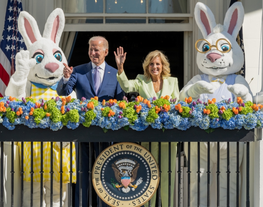President Biden and the First Lady, alongside Easter Bunnies, greet families at the 2023 White House Easter ‘EGGucation’ Roll on April 10, 2023.
