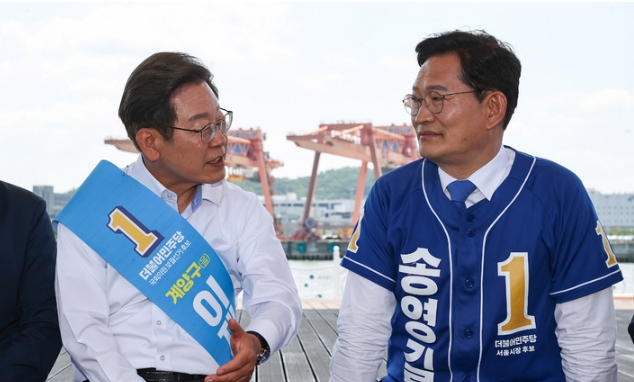 이재명 더불어민주당 인천 계양을 국회의원 후보, 송영길 서울시장 후보가 27일 김포시 고촌읍 아라 김포여객터미널 아라마린센터 앞 수변광장에서 열린 김포공항 이전 수도권 서부 대개발 정책협약 기자회견을 마친 뒤 대화를 나누고 있다. 2022.05.27.