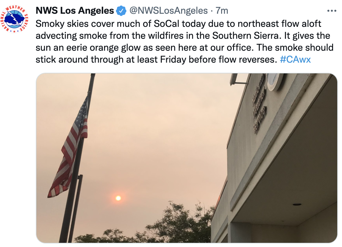 세퀘이아 국립공원을 위협하고 있는 윈디산불은 LA 지역에서 100마일이나 떨어진 곳이지만, 남쪽으로 산불 연기와 재 등이 내려오면서 23일 현재까지 LA 지역 하늘을 노랗게 뒤덮고 있는 중이다.