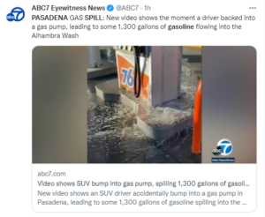 파사데나 소방국이 공개한 영상에 따르면 충돌한 주유기에서는 이후 개솔린이 흘러나오기 시작했다.