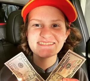 미네소타주 소재 맥도날드에서 질식한 고객을 살린 알바생 시드니 레일리가 경찰에 수여 받은 상금 100달러를 들고 환하게 웃고 있다. (출처 : 트위터 화면 캡처)