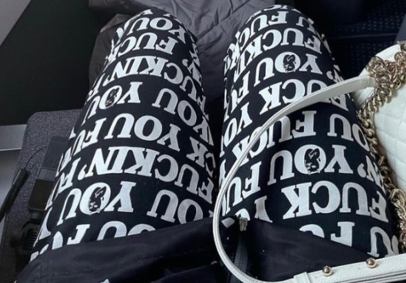 공유된 사진엔 DJ소다가 착용했던 바지 모습도 담겼다. 영어 비속어가 프린트 된 모습과 이후에는 바지를 뒤집어 입은 모습도 포함됐다.