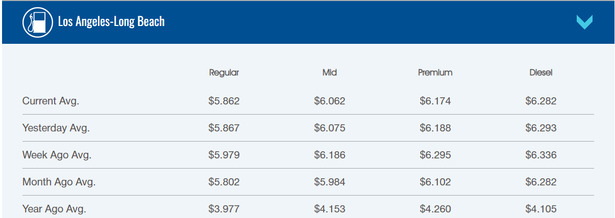11일 전미 자동차협회(AAA)에 따르면 LA카운티 평균 가솔린 가격은 이날 현재 현재 전날 보다 5센트 하락한 5.862달러를 기록했다.