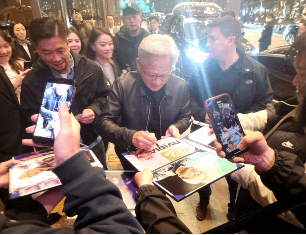 젠슨 황 엔비디아 최고경영자가 30일 저녁 이재용 삼성그룹 회장, 정의선 현대차그룹 회장과의 ‘치킨 회동’에 가기 전 호텔 앞에서 팬들에게 사인을 해주는 모습.  photo@newsis.com
