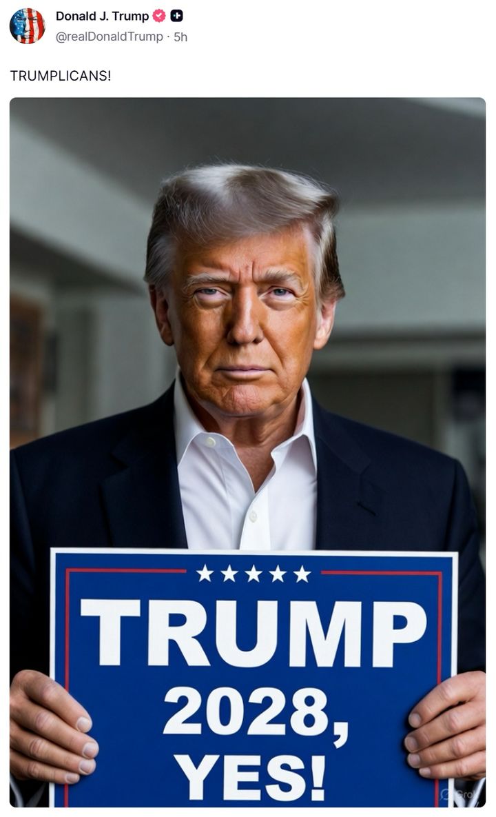 28일 트럼프 대통령 트루스소셜에 게시된 사진은 인공지능(AI) 생성 이미지로, 미소 짓는 트럼프 대통령이 양손에 ‘트럼프 2028, 예스!’라는 문구가 적힌 피켓을 들고 있다.