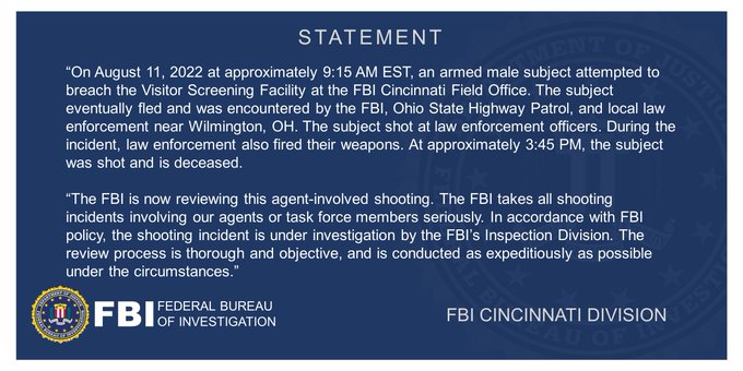 FBI도 11일 성명을 내고 이날 오전 9시15분께 오하이오 신시내티 사무소에 무장한 괴한이 침입하려는 시도가 있었다고 밝혔다. 지부는 경보를 가동하고 무장 특수요원과 함께 대응했다고 말했다.