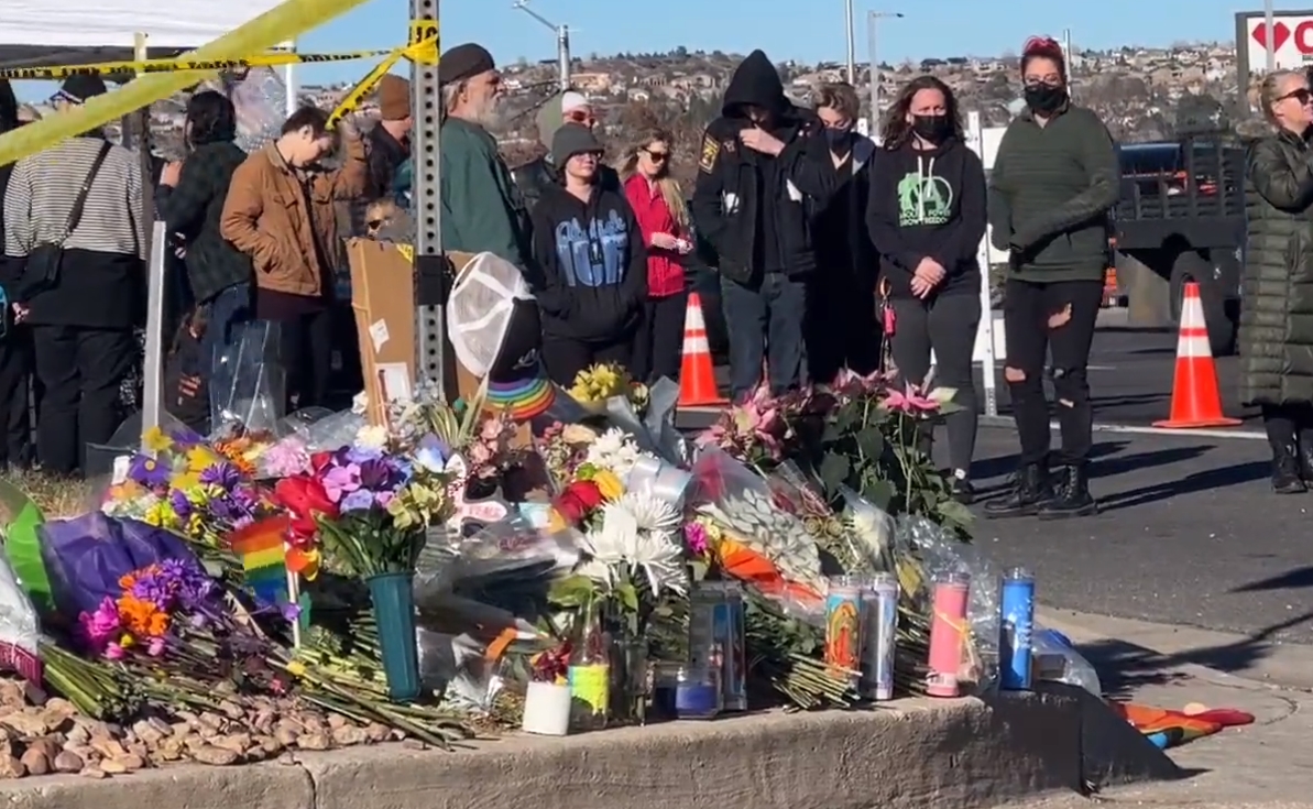 NEW VIDEO: Mourners create a small memorial of flowers and candles near the entrance to #ClubQ in #ColoradoSprings hours after the shootings that killed at least 5, injured dozens more.