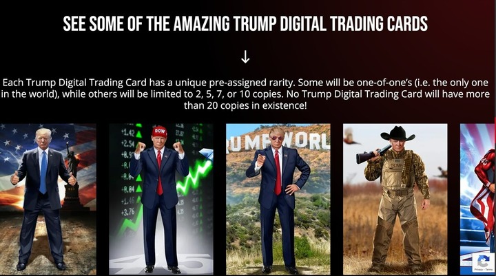트럼프는 2년 전 대선에서 패배한 이래 권력이 없어도 돈을 벌 수 있는 방안을 찾아냈다. 재출마할 것이라고 믿는 지지자들로부터 수천만 달러를 모금했고 대통령 재임 시절의 사진 모음집을 발행해 돈을 벌었다. 책 한 권에 75 달러를 내는데 디지털 카드에 99 달러는 낼 수 있을 것이라는 게 트럼프의 계산이다.