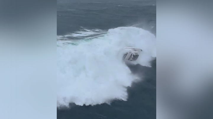 잠시 뒤 엄청난 파도가 몰아쳐 요트가 뒤집어지면서 조난 신고자가 바다로 빠졌다. 구조요원이 재빨리 헤엄쳐 가 헬기에 연결된 케이블에 신고자를 연결했다.