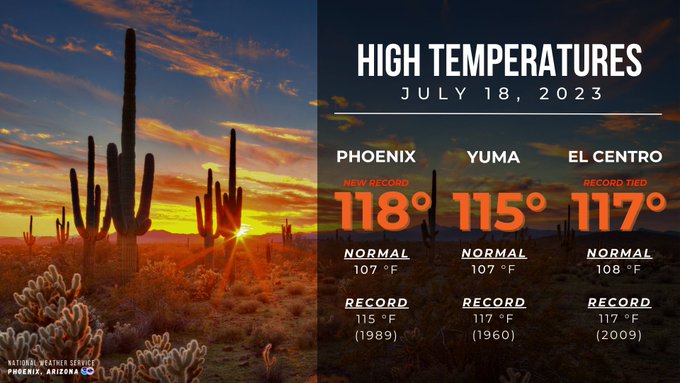 이날 피닉스 지역 낮 최고기온은 1117도로 1989년의 115도를 넘어 역대 7월 18일의 최고기온 기록을 경신했다.