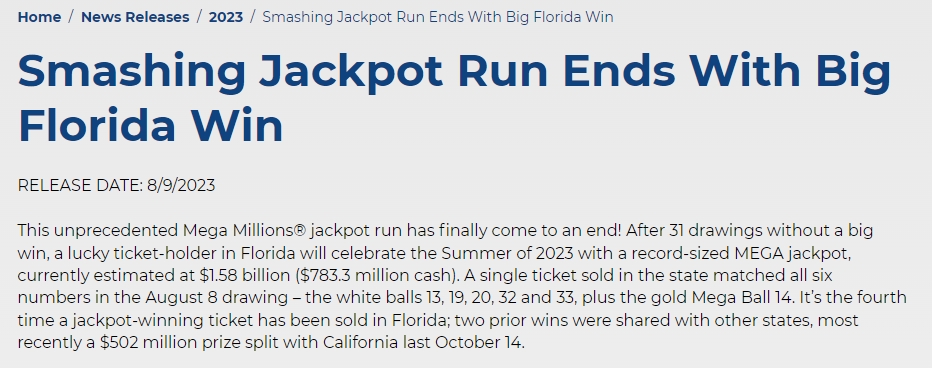 플로리다의 어느 지역에서 복권이 판매됐는지, 누가 당첨됐는지에 대한 것은 공개되지 않았다.