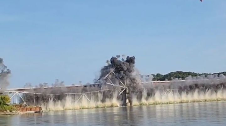 미주리 강 제방과 온라인에서 사람들이 지켜보는 가운데 10일 오전 9시쯤 미주리 강에 걸쳐있는 유서 깊은 버팀다리 구조 철교가 폭파해체됐다.