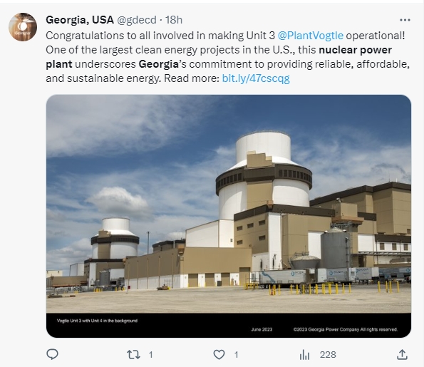 미국에서는 1990년 이후 1996년과 2016년 왓츠바에 있는 두 개의 원자로와 지난달 31일 보글 3호기 등 3개의 원자로만 가동됐다.