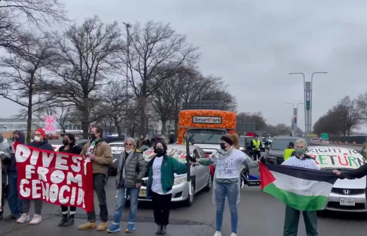 뉴욕시에서는 시위대와 활동가들이 서로 팔짱을 끼고 도로를 막았다. 이들은 이스라엘-하마스 전쟁을 중지하고 팔레스타인인들의 인권을 보장하라는 내용의 깃발과 팻말을 들고 시위를 벌였다.