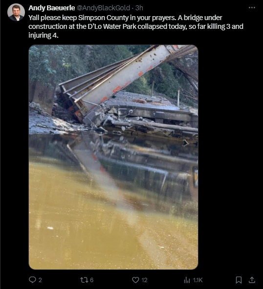 Andy Baeuerle@AndyBlackGoldYall please keep Simpson County in your prayers. A bridge under construction at the D’Lo Water Park collapsed today, so far killing 3 and injuring 4.