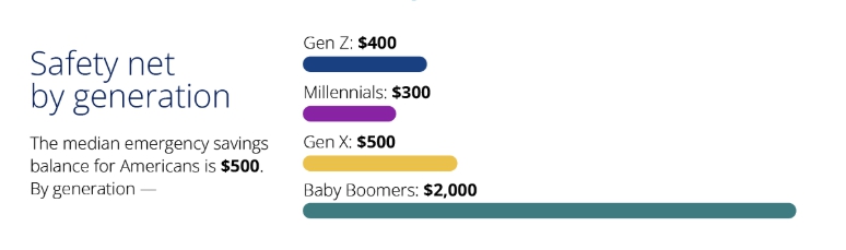 금융 서비스 업체 엠파워(Empower)가 최근 발표한 조사에 따르면 미국인의 비상금 중간값은 500달러에 불과했다. 세대별로는 베이비붐 세대가 2,000달러를 저축해 가장 많은 여유를 보였지만, Z세대는 400달러, 밀레니얼 세대는 300달러에 그쳤다.
