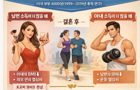 2년마다 추적한 부부 3744쌍에서 나온 1만3238건의 데이터를 분석한 결과, 남녀 모두 BMI를 상대적 소득 변화에 따라 조정한다고 한다. 아내의 소득 비중이 늘면 아내는 살이 찌고, 남편은 살이 빠졌다는 것이다. 남편의 소득 비중이 늘면 그 반대 현상이 나타났다.