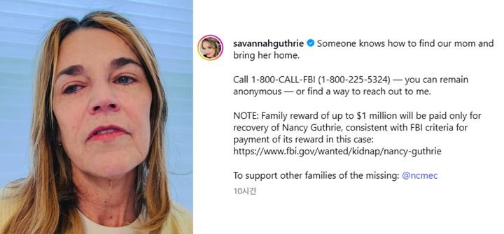 24일 AP통신, BBC 등에 따르면 미국 NBC ‘투데이’ 앵커인 서배너 거스리는 어머니 낸시 거스리(84)를 찾기 위해 최대 100만 달러의 보상금을 내걸었다.