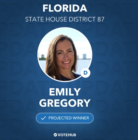 24일 폴리티코에 따르면, 민주당의 에밀리 그레고리 후보는 플로리다주 제87선거구 하원의원 보궐선거에서 도널드 트럼프 대통령의 지지를 받은 공화당의 존 메이플스 후보를 꺾고 당선됐다. 이번 승리로 민주당은 공화당의 압도적 우위가 지속되던 플로리다주 정계에서 반전의 기틀을 마련하게 됐다.