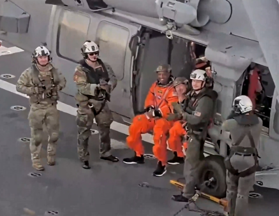 우주 임무를 마치고 귀환한 우주비행사 크리스티나와 빅터가 USS 존 P. 머서함 갑판에서 후속 의료 검진을 기다리며 환한 표정을 짓고 있다. 사진 출처 NASA