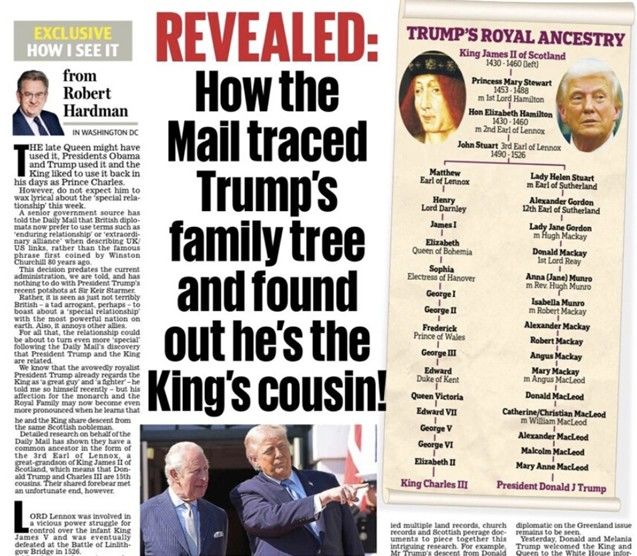데일리 메일 왕실 전문 작가 특종 보도라며 트럼프와 찰스 3세 가계도 올려