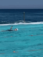 호주 시드니의 수영장 레일에서 한 여성이 배영을 하면서 스마트폰 화면을 넘긴 뒤 사진을 찍는 자세를 취하고 있다. (사진=browncardigan 인스타그램)