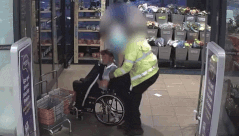 슈퍼마켓에서 맥주를 훔치기 위해 장애가 있는 것처럼 위장하던 영국 10대가 휠체어에서 벌떡 일어나 경비원을 폭행하는 황당한 일이 벌어졌다. (영상=’Kent Police’ 유튜브 채널 캡처)