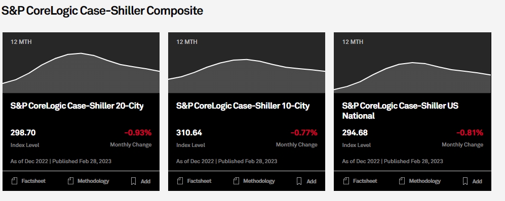 S&P 다우존스 인디시스는 “2022년 6월 시작한 주택가격 약세가 연말까지 이어졌다. 12월은 6개월 연속으로 지수 신장세가 둔화했다”고 지적했다.