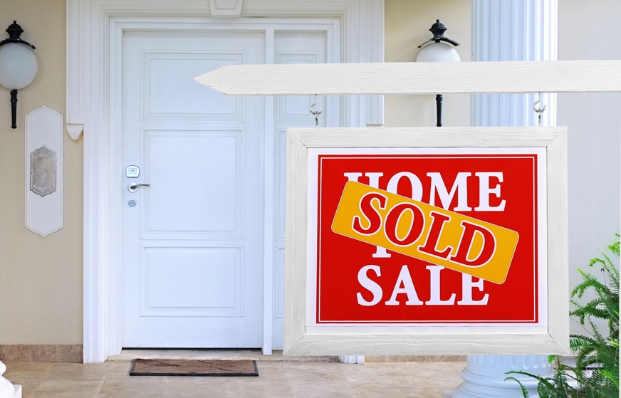 Sold home for sale Real estate sign in front of new house By Africa Studio