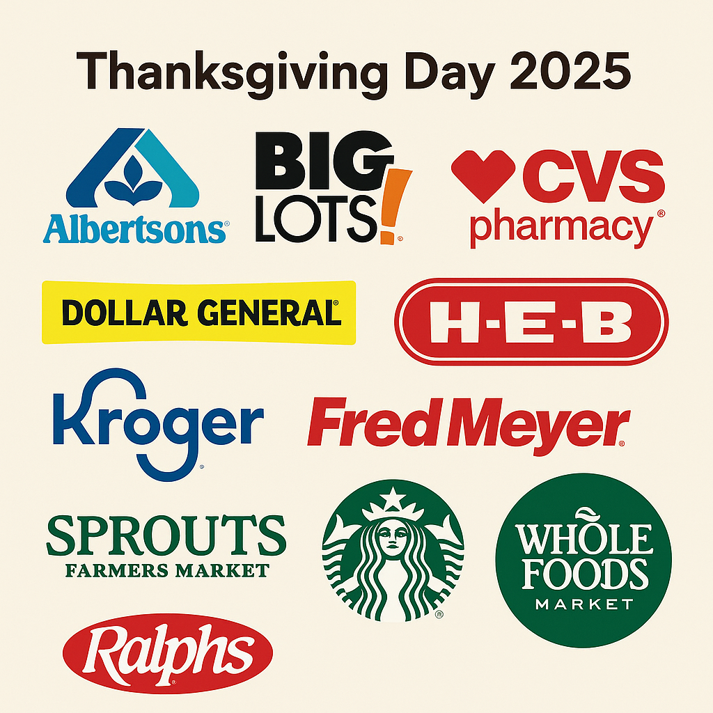 메이시스, 타깃, T.J. 맥스·마샬스·홈굿즈 역시 모두 휴점하며, 트레이더 조스는 추수감사절뿐 아니라 크리스마스, 새해에도 휴점을 유지한다.