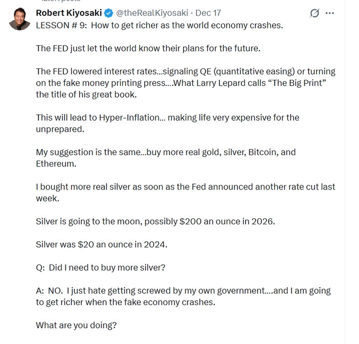이 가운데 그는 은을 내년 가장 유망한 자산으로 꼽았다. 기요사키는 지난주 연준의 추가 금리 인하 발표 직후 실물 은을 추가 매입했다고 밝히며 “은이 역사적인 가치 저장 수단으로서의 역할에 비해 여전히 저평가돼 있다”라고 강조했다.